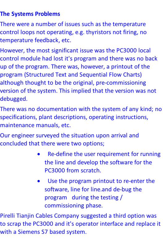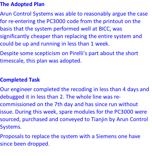integrated control and monitoring systems go to instrumentation go to instrumentation go to instrumentation go to instrumentation go to instrumentation go to instrumentation SSD motor AC Drives Re-programming the system using the Eurotherm PC3000 programming tool, PS Re-programming the system Heater control panel - Eurotherm Thyristors Arun Control Systems was asked to provide engineering assistance by Pirelli Tianjin Cables Company at their manufacturing site in the North Eastern city of Tianjin. Tianjin is about 90 minutes from Beijing. Case Study - Tianjin, China s